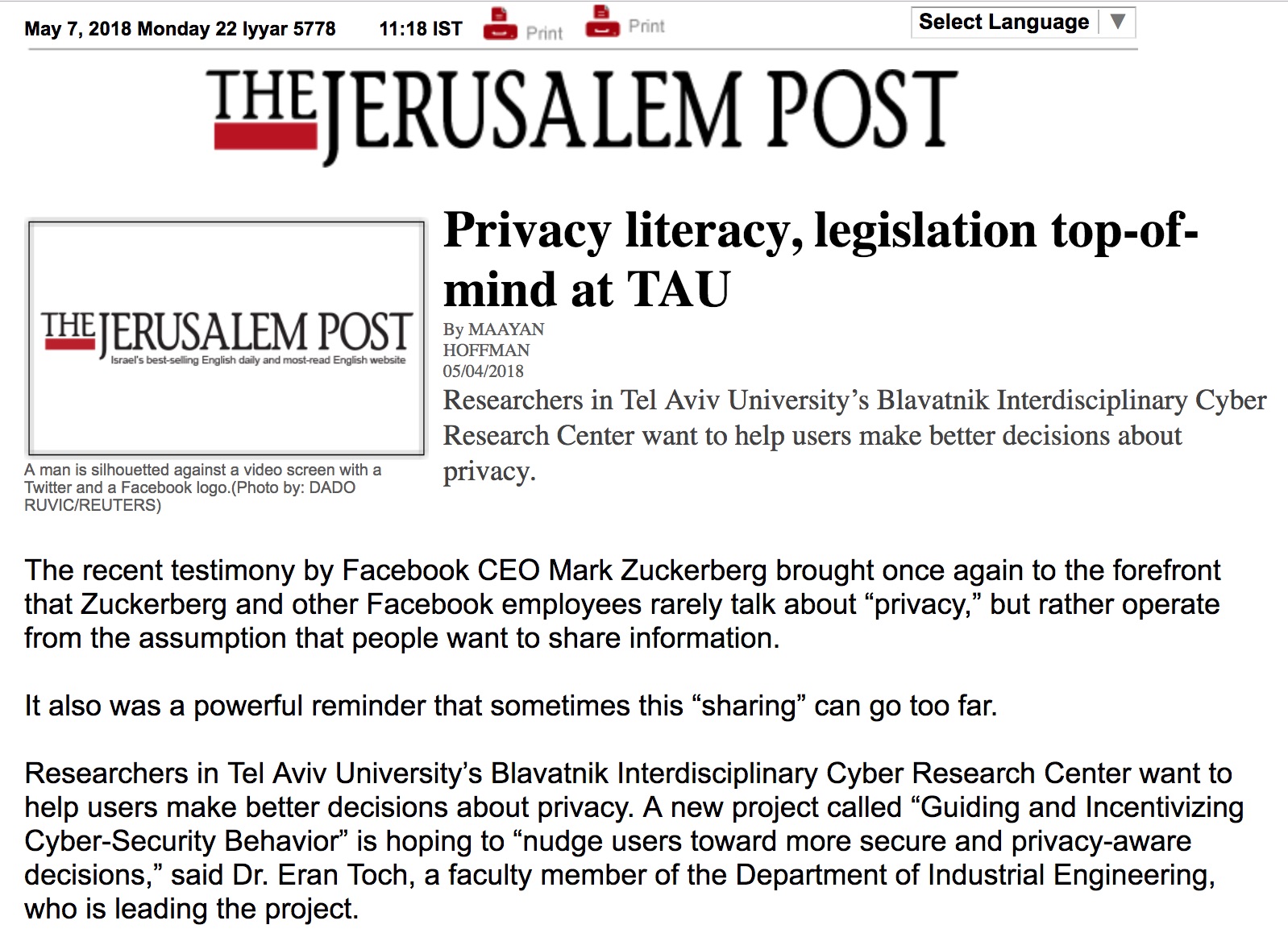 An article about some new research projects in the lab just published at the Jerusalem Post. The projects include privacy in smart cities, privacy choice architectures, and controlling genetic privacy.