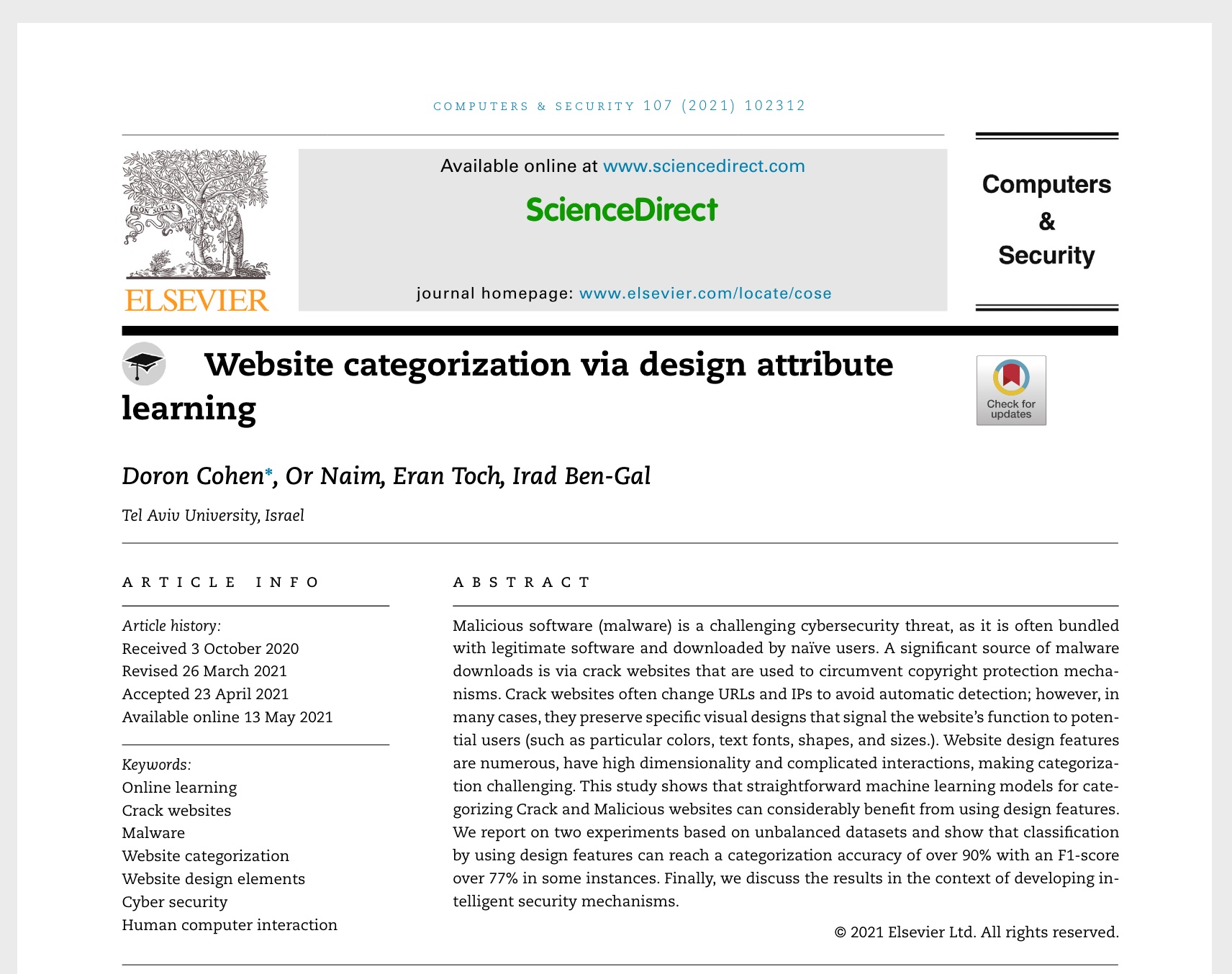 Eran had contributed to a new paper by the LAMBDA Lab headed by Prof. Irad Ben-Gal. The paper, by Doron Cohen, Or Naim, Eran Toch, and Irad Ben-Gal, suggests a new way to categorize crack websites, which contain a mixture