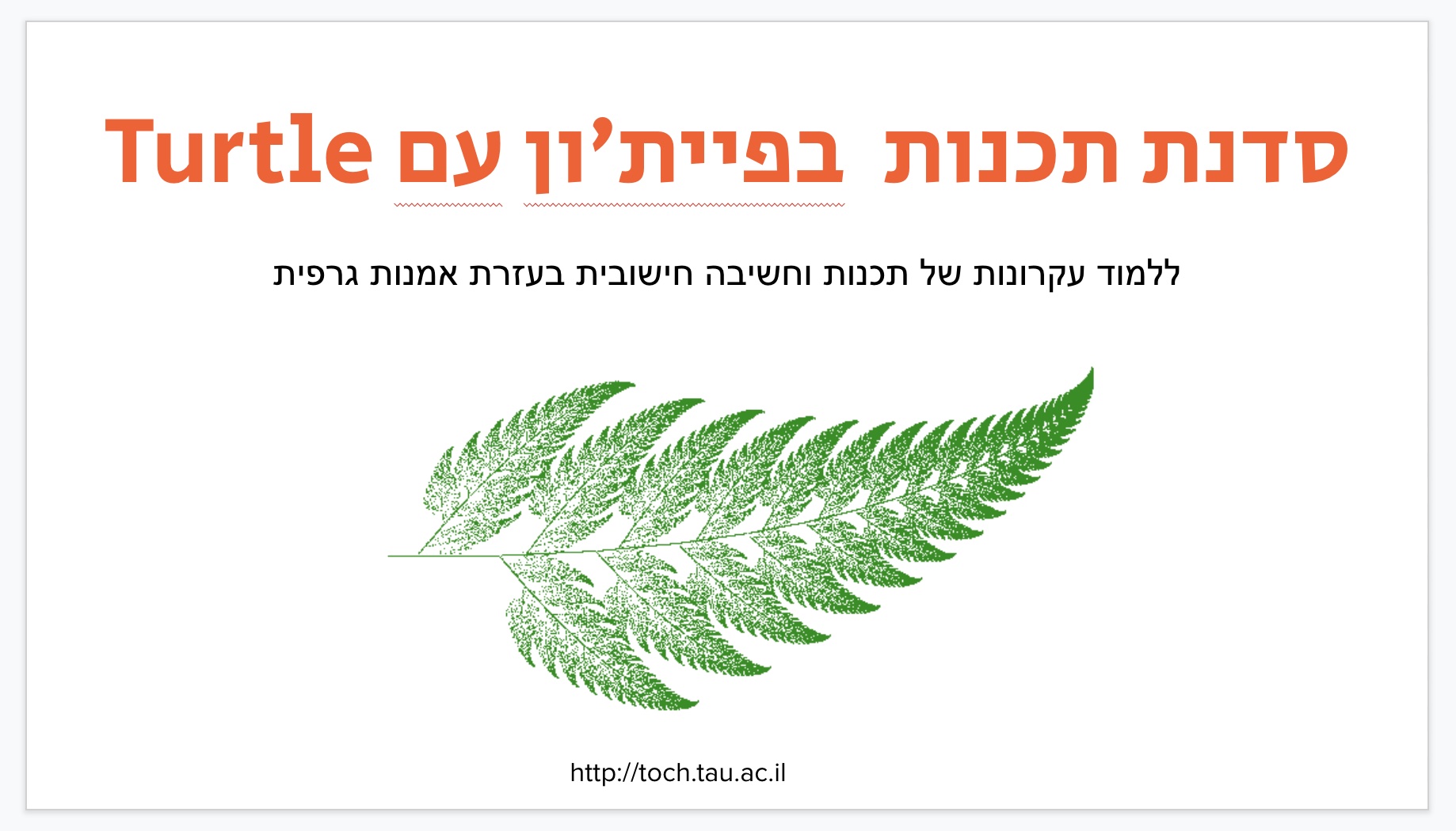 In unrelated news, here is the material for a Python programming workshop that we run in our local high school. The workshop, in Hebrew, is based on the Turtle visual programming package, which uses a Logo-like graphic programming model. The