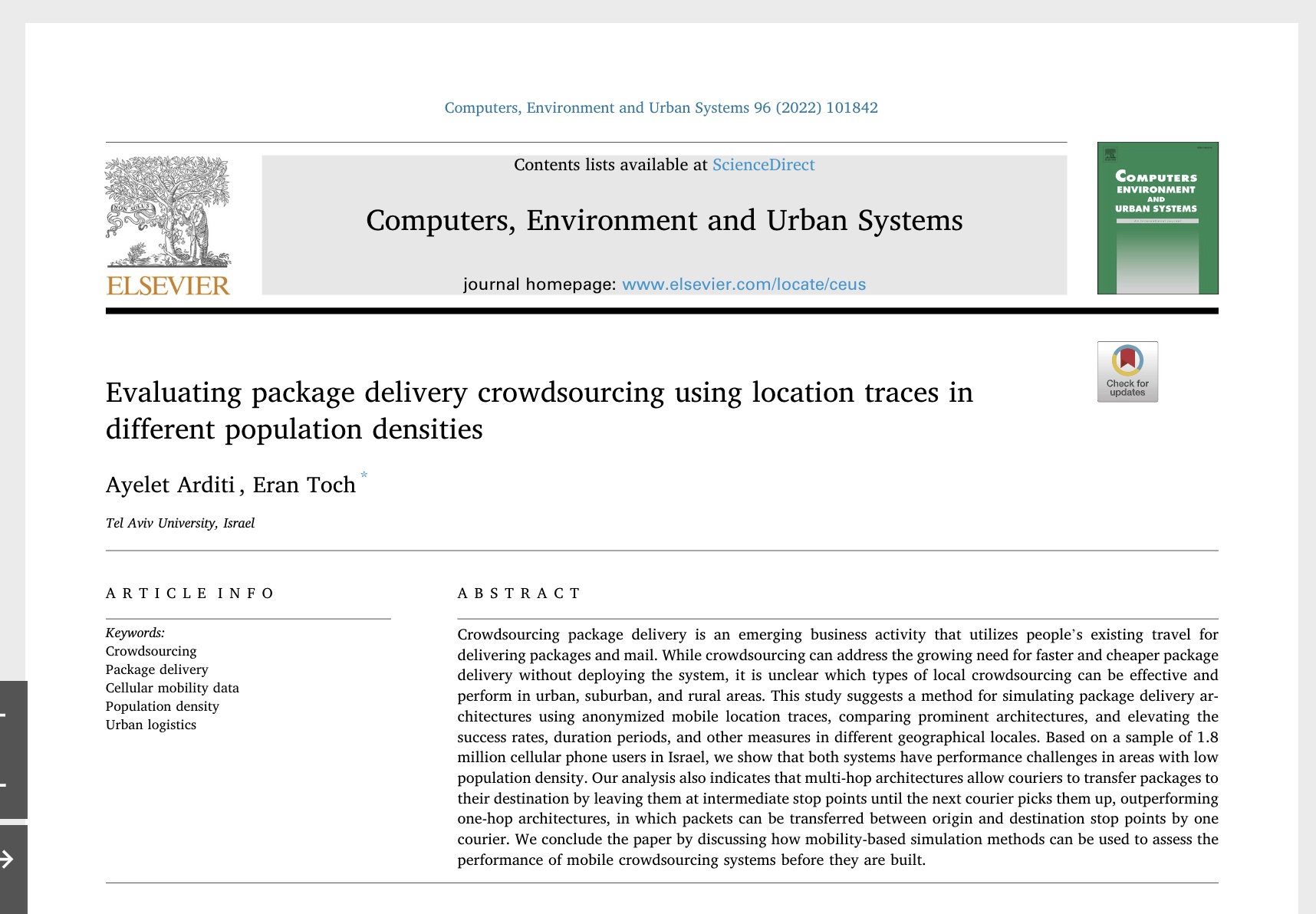 Our paper was just published online in the journal Computers, Environment and Urban Systems: Evaluating Package Delivery Crowdsourcing using Location Traces in Different Population Densities by Ayelet Arditi and Eran Toch. In the paper, we use massive data about people’s movements to