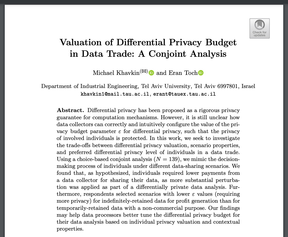 A new paper, Valuation of Differential Privacy Budget in Data Trade: A Conjoint Analysis, by Michael Khavkin and Eran Toch was published in the Privacy and Identity Management IFIP Proceedings! In the article, we analyze the decision-making process of people who