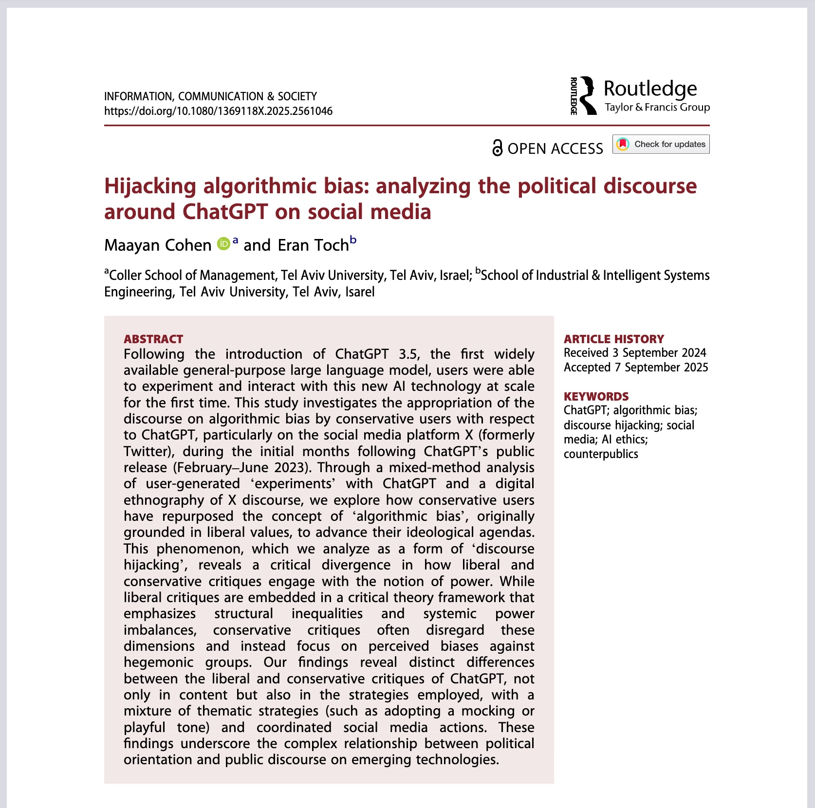 We have a new paper just published in Information, Communication & Society. Maayan Cohen and Eran Toch are looking at how the discourse around algorithmic bias was taken up, amplified, and reframed across ideological lines in the launch of ChatGPT 3.5.